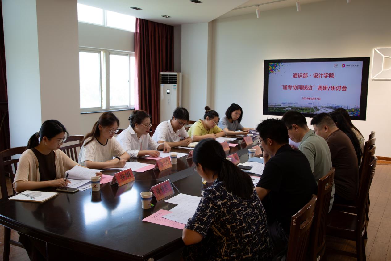 6月17日,设计艺术学院与通识教育教学部召开“通专协同联动”专题研讨会。通识部党总支书记/部长盛杨带队英语教研室主任黄英明、教师张霞、信息技术教研室丁艺老师,与设计学院院长段笔耕、副院长张磊同专业带头人及骨干教师代表一起,聚焦课程改革方案落地,共探英语与信息技术在设计类专业人才培养中的深度融合路径。本次研讨会直击通识课程改革痛点——专业情境赋能基础课程,深入研讨了《英语、信息技术课程优化改革方案》与设计类专业英语与信息技术课程教学项目和任务设计方案。