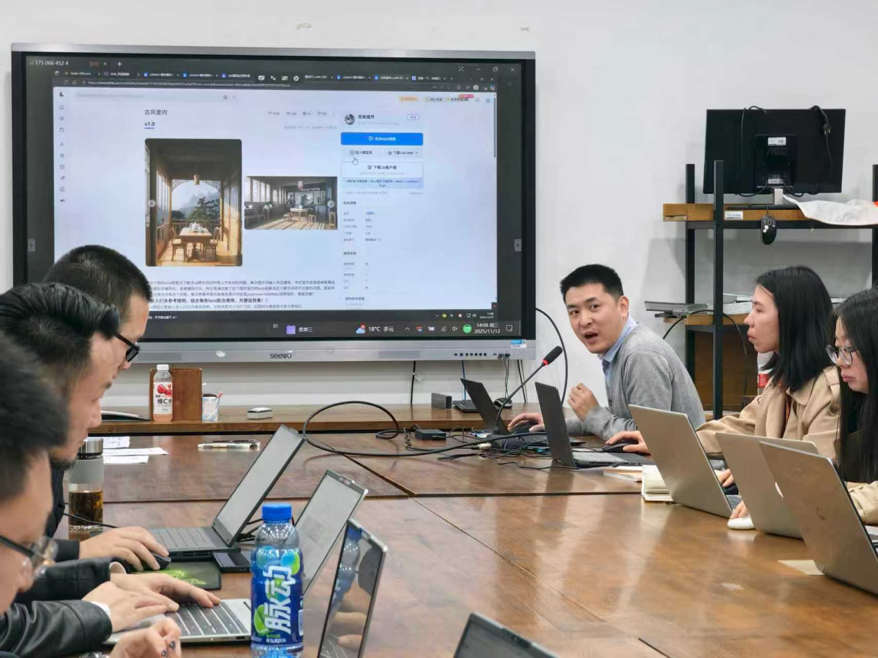 11月12日下午,设计学院装饰教研室“智创赋能・师者共进——AI工具实操与教学创新研讨会”活动在天工楼B613开展。本次研讨会以AI技术与专业教学的深度融合为核心主题,旨在探索数字时代教学创新路径,装饰教研室全体教师及金数能人工智能科技有限公司AI研究中心主任夏文渊受邀参会,共同开启AI赋能设计教育的深度研讨。